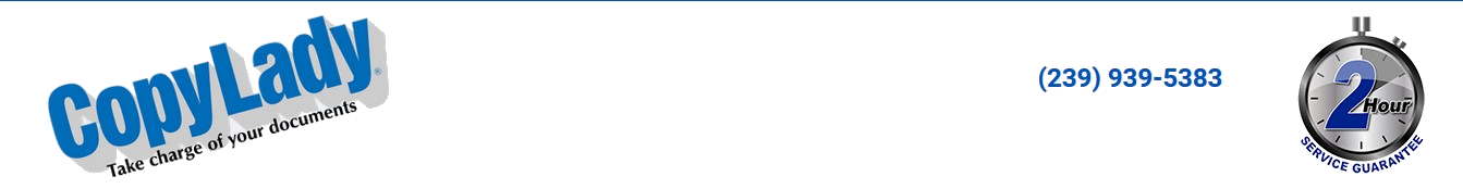 CopyLady: Proudly serving SouthWest Florida since 2002!Rent a CopyLady Copier today!Do you need a copier for just a little bit? Maybe for just one day, or even one year? CopyLady can help you!At CopyLady, We carry Multifunction Printers from major brands such as Epson, Kyocera, and KIP.No matter how long you need a copier for, whether it's one day, a week, a month, a year, or more, We got you covered!At CopyLady, we ensure that the quality goes IN, before the name goes ON!Whether you rent, lease or own your copier, you still get the same amazing service!That's right! Just like our clients who lease or own their copiers, renters also benefit from the CopyLady 2-Hour response guarantee!We are the ONLY dealer in the WORLD to offer service this fast! No matter what help you need, or what the issue with your machine is,We will be there within 2 hours of you calling us! Our highly trained technicians are fully certified, and ready to help get your machine up andrunning again! In many cases, we can help you solve your issues over the phone without a technician coming to visit! Our highly skilled help desktechnicians can solve just about any issue, big or small, during your phone call to us. If we can't fix it here, we'll fix it there within TWO HOURS!You provide the paper, we provide the supplies!No matter the duration of your rental, your copier still comes with the same great CopyLady service agreement, which comes with the necessary supplies for your machine!What's better, is thanks to our revolutionary Toner Replenishment System (TRS), You'll NEVER have to call and order toners! We'll handle it all for you!Once we see you are low on a toner, One of our technicians will bring a fresh one out to you! We carry a full selection of toners and inks in our Fort Myerswarehouse, No need to wait for it to come from some other state! And yes, It's FREE!!!Need a BIG PRINTER?........We rent those too!Blueprints? Posters? Banners? Mapping out your underground bunker? Rent a CopyLady plotter today!With sizes up to 44 inches, Let your creativity soar! Razor sharp Black & White, and Colors so real, You'd think it was an art piece!Ready to rent an amazing copier or printer? Call us at 239-939-5383!Don't settle for the least, Go for the best! Like what you see? Call now or check out our specials!Call CopyLady Today at 239-939-5383 Serving Southwest Florida since 2002.